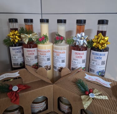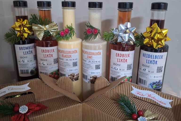 Die Likörflaschen werden mit viel Liebe weihnachtlich und festlich dekoriert – ideal als kleines Mitbringsel in der Adventszeit oder als besondere Aufmerksamkeit für Familie, Freunde und Kollegen. Jede Flasche ist ein kleines Geschenk für sich und eignet sich perfekt, um Freude zu bereiten.